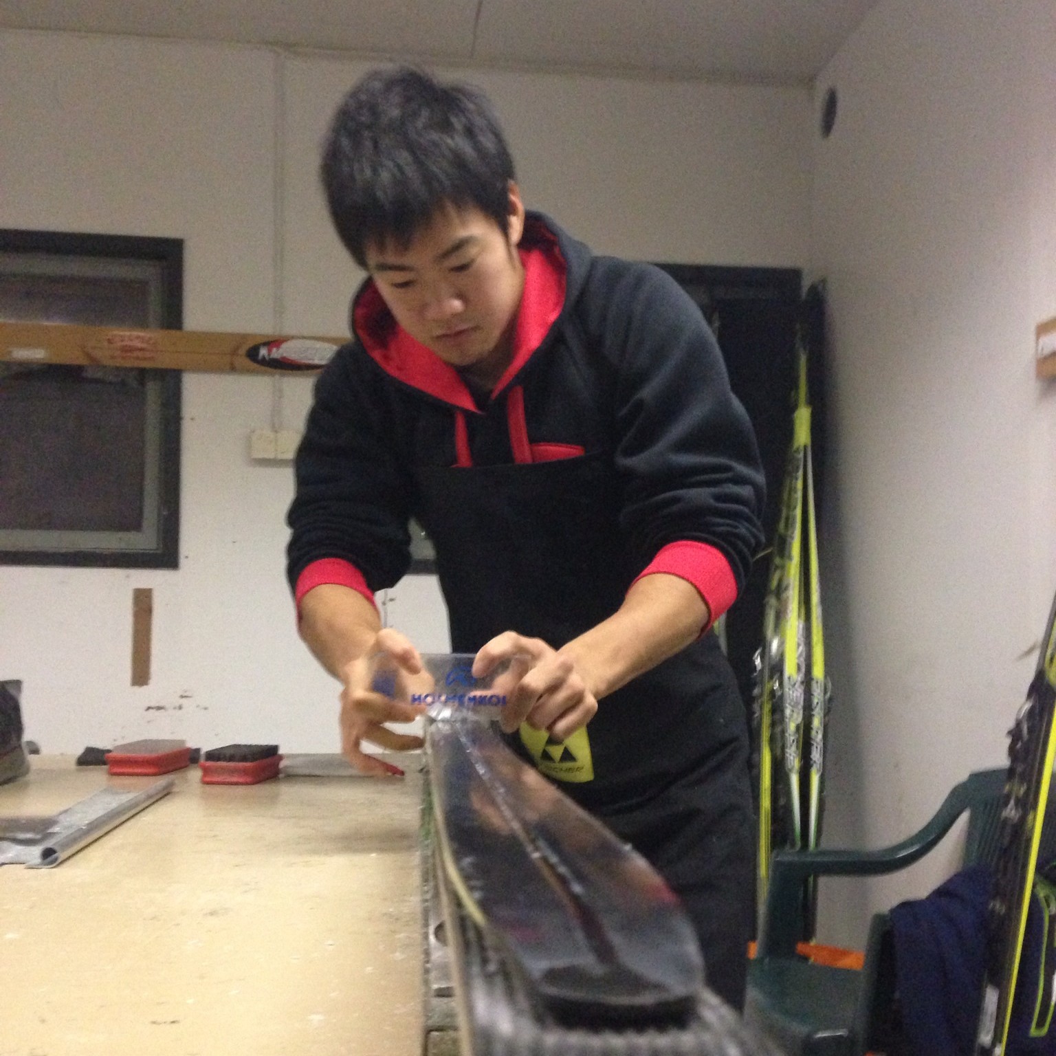 トレーニングをする一方で欠かせないのがスキーの手入れ。