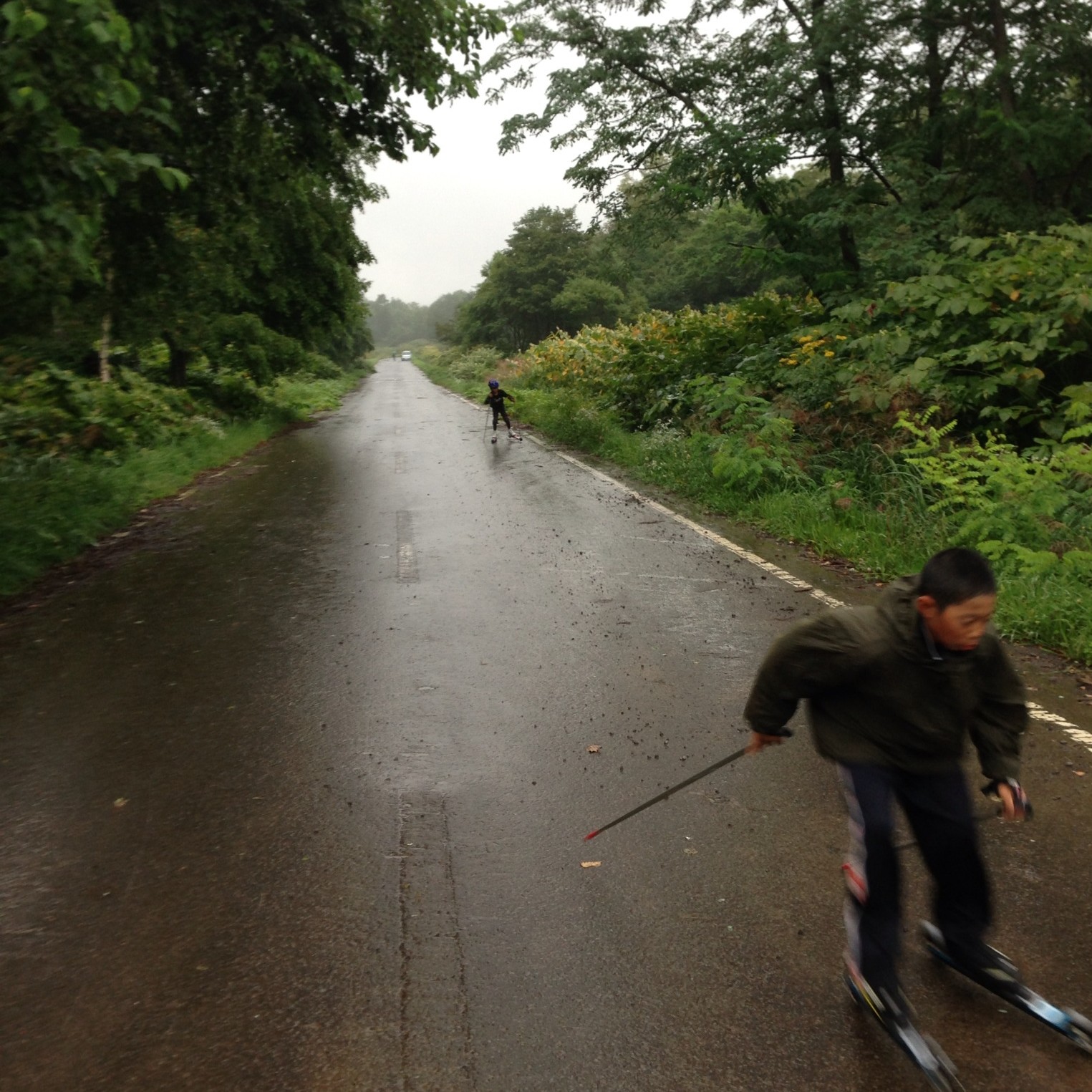 下山した後、ジュニアにローラースキーのコーチングをしました。